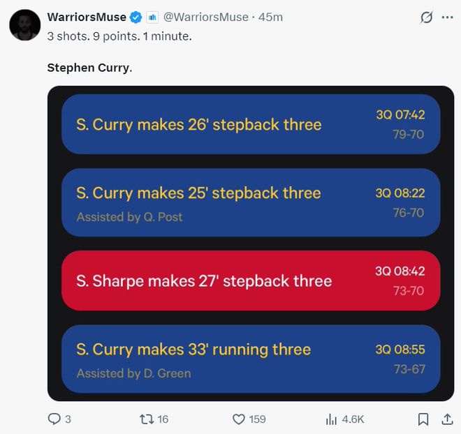 第三节库里在8分55-7分42秒这1分多钟里连续命中三个三分球,你们没有看错,就是连续三个三分球拿到9分,1分钟拿9分,第三节他单节三分6中4拿到12分2助攻1篮板1助攻。
