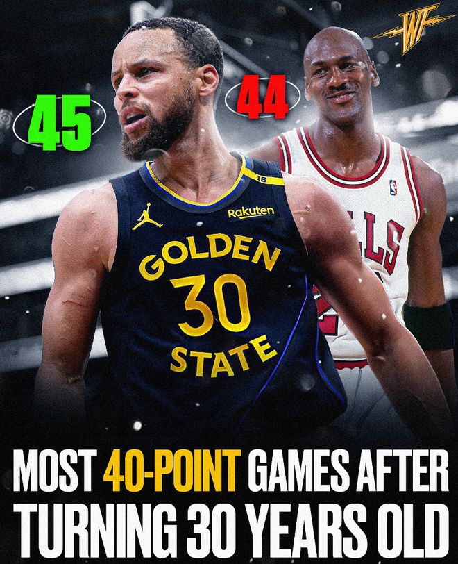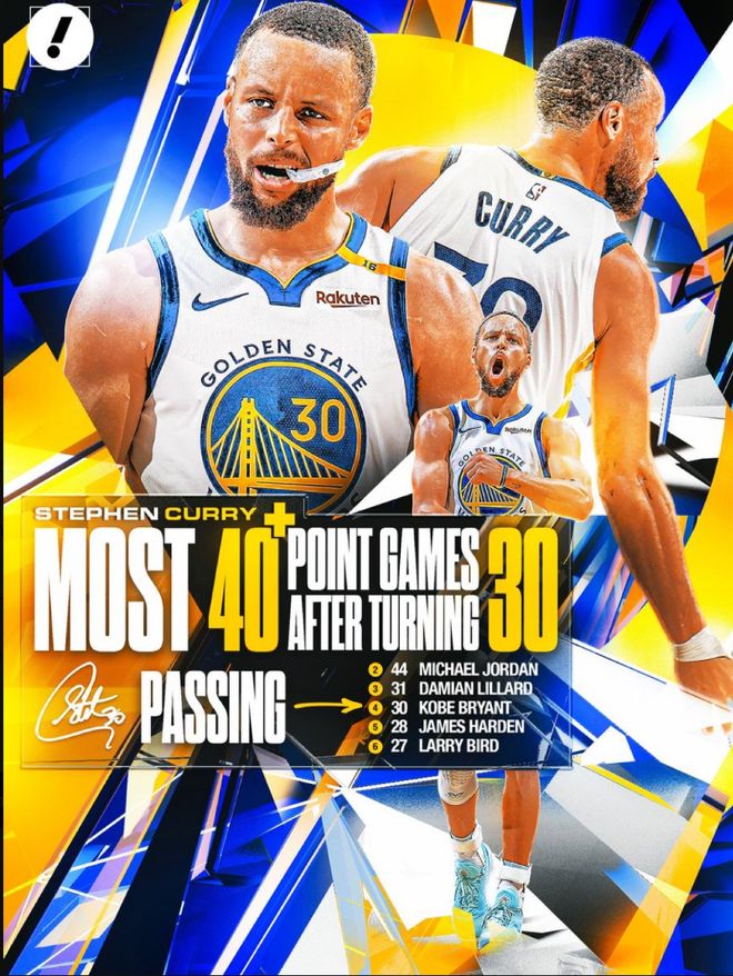 7.库里本赛季第四次拿到40+的数据,联盟35岁以上唯一;